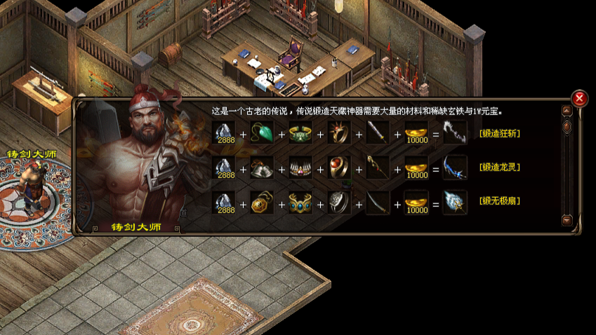 成长的第二核心是神器打造系统。玩家可通过龙城皇宫的铸剑大师NPC消耗玄铁、元宝及装备打造神器。神器共分三类: