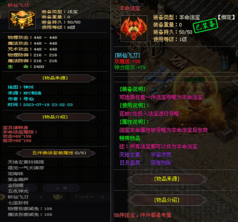 - 神器法宝:游戏共设56件法宝,由不同BOSS专属掉落。分为普通法宝、灵宝与先天灵宝三类,装备后可激活套装属性。本命法宝可通过NPC吞噬激活独有属性,搭配自由多样。