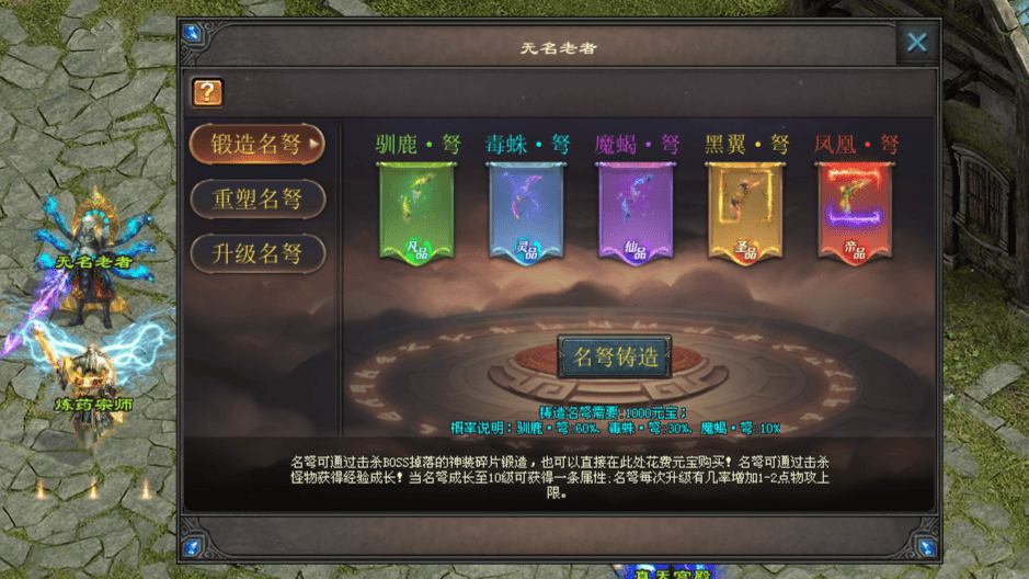 - 名弩系统:可打造五阶名弩,分为毒蛛、魔蝎、黑翼、凤凰等类型,带有特殊攻击效果。