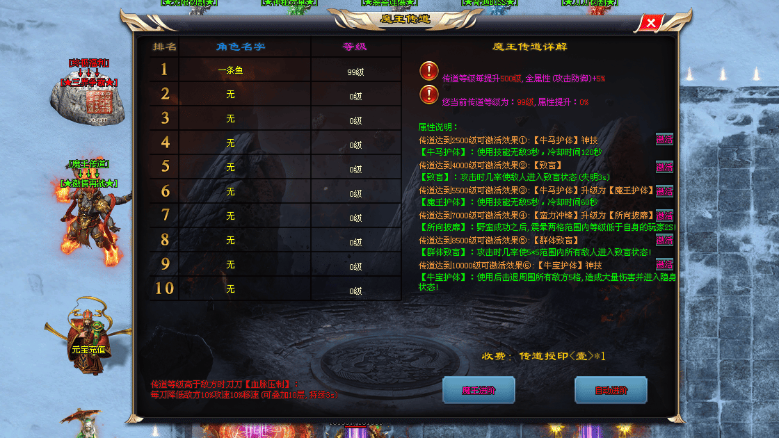 每提升500级魔王传道等级,即可获得全属性+5%的稳定加成,并在达到关键等级时解锁强力专属BUFF。2500级激活牛马护体,可在使用技能时获得3秒无敌;4000级解锁致盲效果,使攻击有几率让敌人失明;5500级后护体效果升级为魔王护体,无敌时间延长且冷却大幅缩短;7000级解锁范围控制能力;8500级获得群体致盲;10000级最终解锁牛宝护体,集击退、伤害与隐身于一体,形成极强的战斗与生存能力。