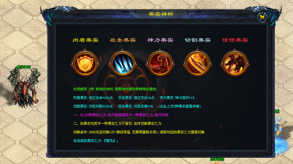 果实神树系统提供长期养成路线。可在多种能力方向中选择点亮升级,并通过吞噬不断叠加对怪伤害与爆率,使后期战力拥有持续抬升空间。