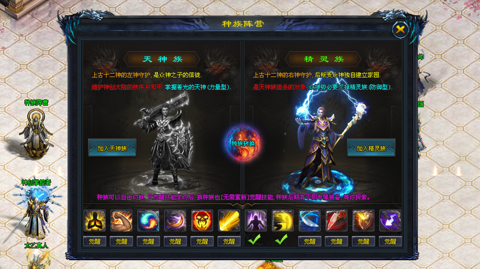 版本以种族阵营觉醒为核心起点。修炼者可在主城选择加入天神族或精灵族,不同种族拥有截然不同的成长侧重。天神族偏向攻击与对怪伤害提升,并可触发追日剑法与麻痹等效果;精灵族则更注重吸血、生存、攻速与爆率加成,使两种路线在刷怪与对抗中形成明显差异。