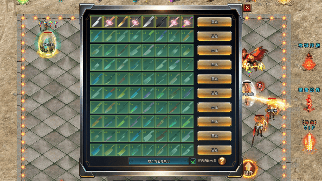 菜刀系统是本版本的标志性玩法。全服共设有80把菜刀,全部依靠打怪获取,属性随编号逐步提升。菜刀不仅提供基础属性加成,还包含爆率与攻击加成,是战力构成的重要组成部分。