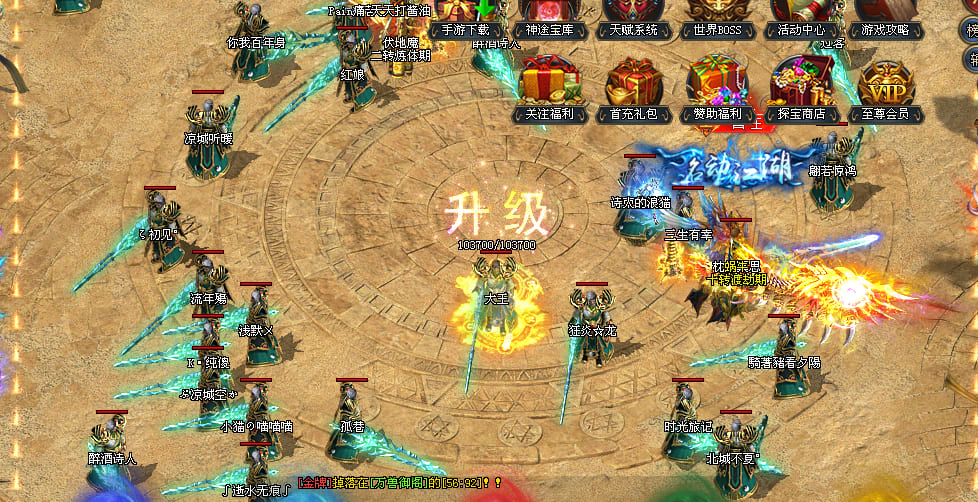 - 四象神器:消耗神器碎片与元宝提升四象勇者属性,激活后可开启“10×10范围聚怪”功能。刀刀切割与回血特效让打怪效率翻倍。