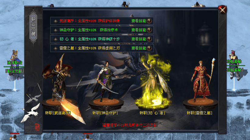 - 职业觉醒:在第一大陆安全区职业觉醒NPC处选择职业,使用历练之书进行觉醒。初次觉醒获得专属技能,全属性+10%;转生15转后可二次觉醒,解锁多种被动技能。