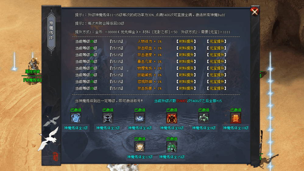 - 神魔炼体:八种属性(体力、吸血、攻速、暴击、免伤、技能减伤、忽视防御、攻击伤害)逐步提升,最高15级。每级提升1%,累计5400次强化后可激活终极BUFF。